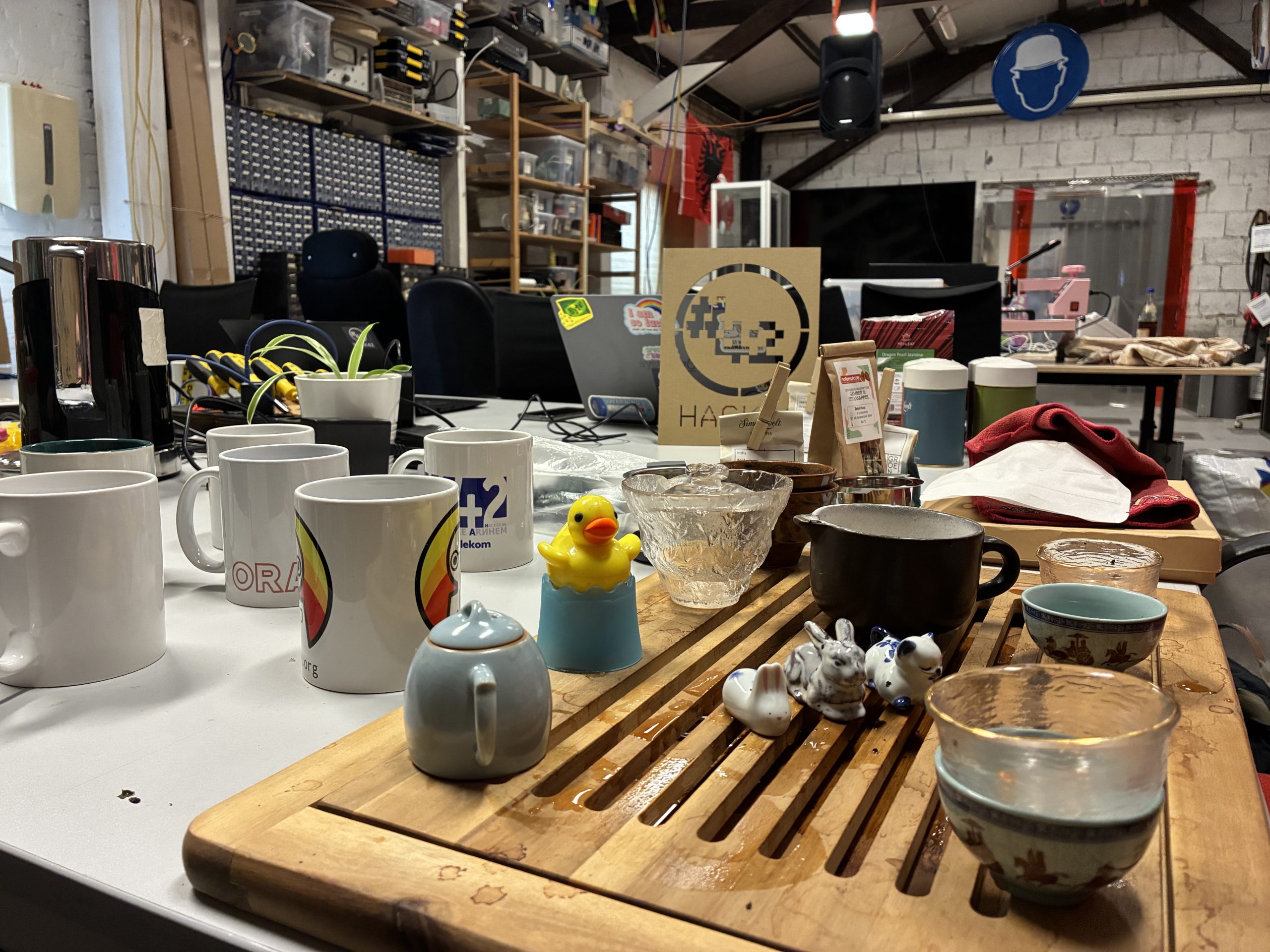 Er hing een serene sfeer in de space vandaag, we kwamen vandaag niet om (alleen maar) te programmeren, t-shirts drukken en solderen, maar vooral ook om thee te proeven. Squirl had een theedrink sessie georganiseerd, en het blijkt dat dit een heel eigen ding is om over te nerden. Van Chinese- en Japanse- tot kruidentheetjes, er was keuze genoeg. Van Pu erh tot jasmijn en hippiethee tot kerstmelange, er waren ontzettend veel te proberen en er werd allerlei informatie over gedeeld. Daarnaast kon je thee verschillend ervaren, vanuit een gaiwan in superschattige kleine kopjes tot uit de klassieke theepot in mokken.