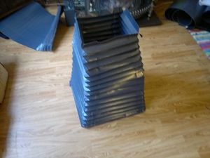 Omdat de balg uit ribbels bestaat die in meest uitgerekte staat precies haaks zijn, kun je met de stelling van pythagoras uitrekenen hoe lang je de balg moet ontwerpen. Ik heb uiteindelijk voor 1,20mtr gekozen. Ook de ribhoogte moet niet te klein gekozen worden voor dit materiaal. Een experiment met een ribhoogte van 2,5cm mislukte. Die viel niet te buigen en in vorm te houden.